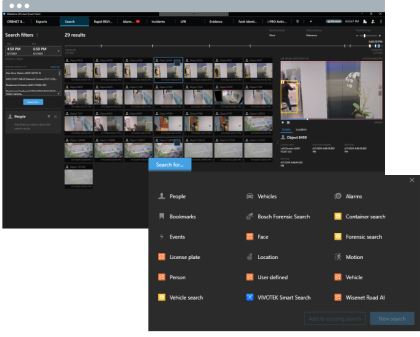 - Search for alarms, human motion, events, bookmarks, and metadata within your chosen timeframes